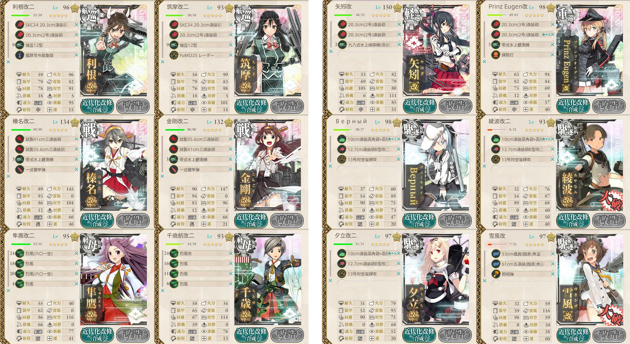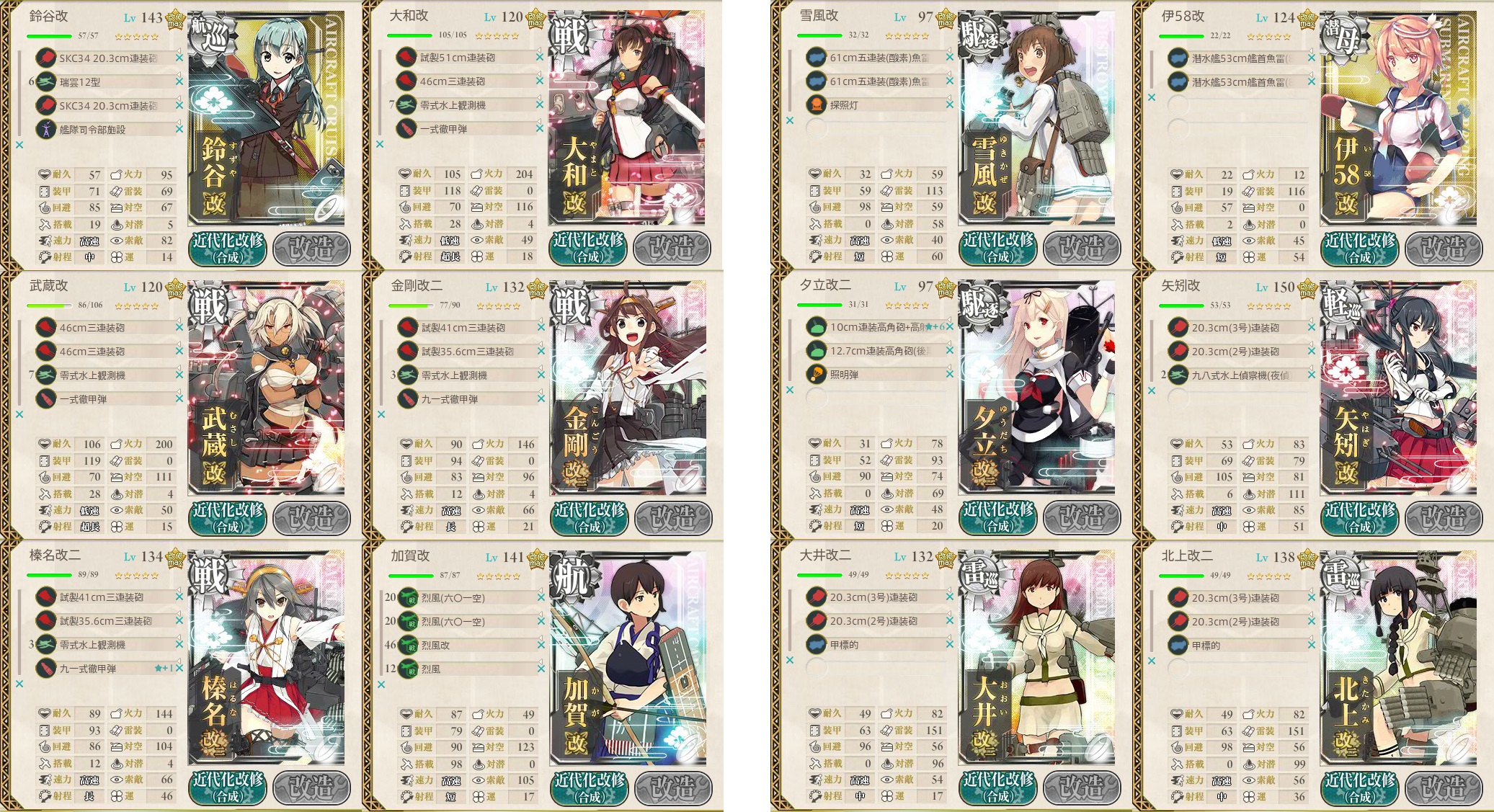 ボス前の索敵判定用に軽巡には観測機、駆逐には電探を装備