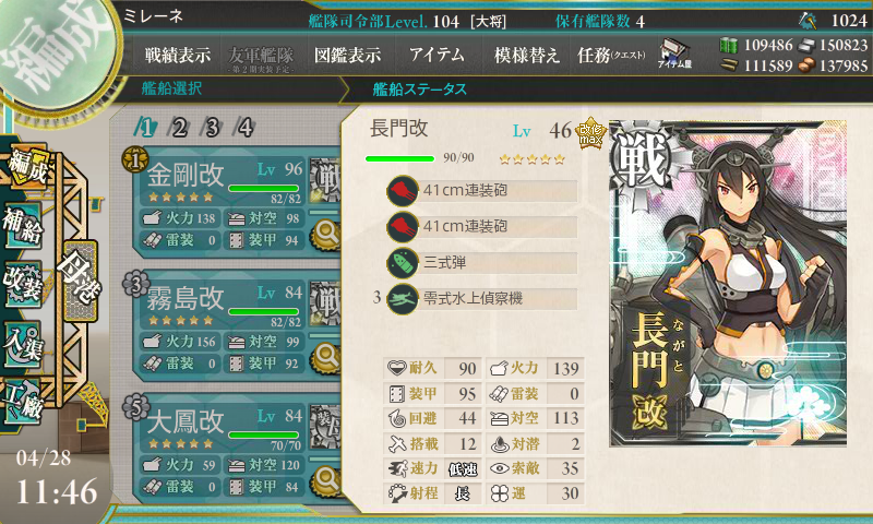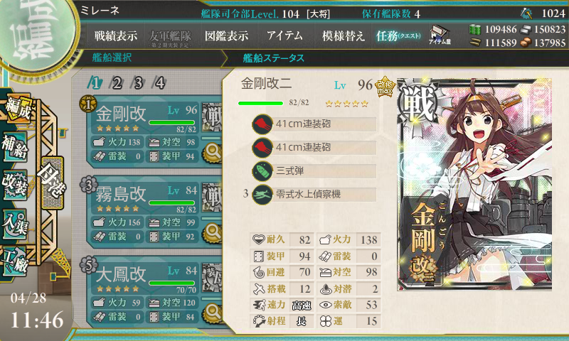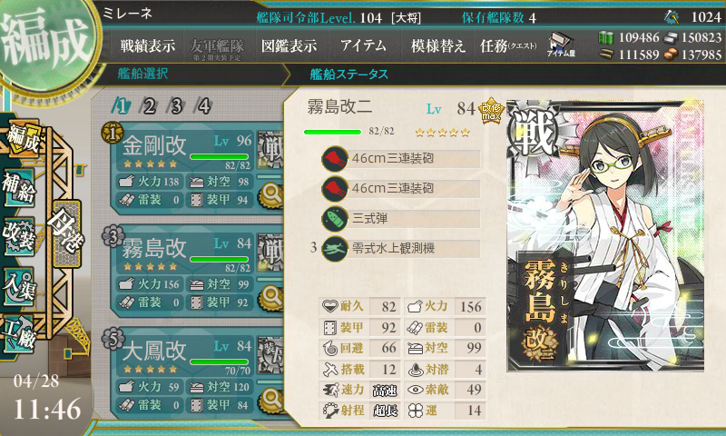 装備に関しては戦艦は主砲2本、ボス用の三式弾、昼連撃用の偵察機(観測機)