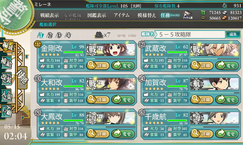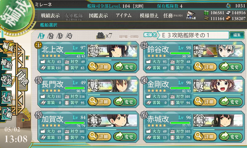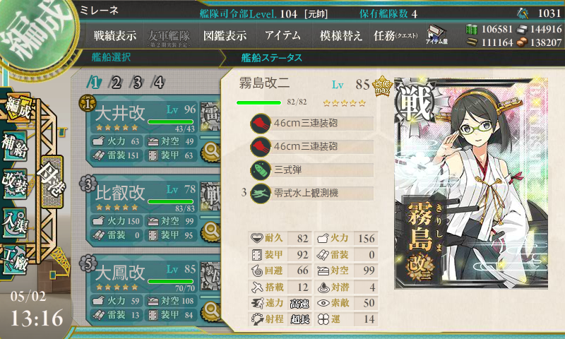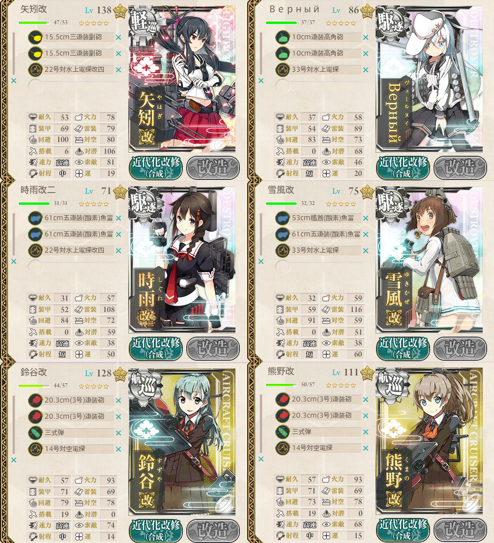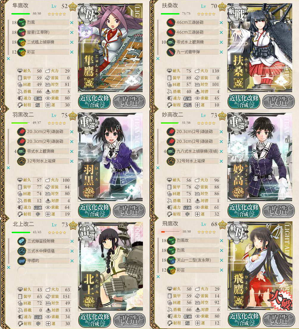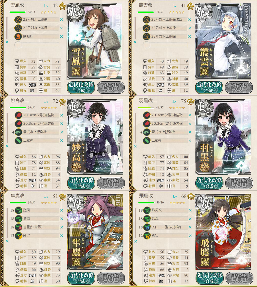 続いて編成と装備の紹介、2艦隊でローテ出撃してました