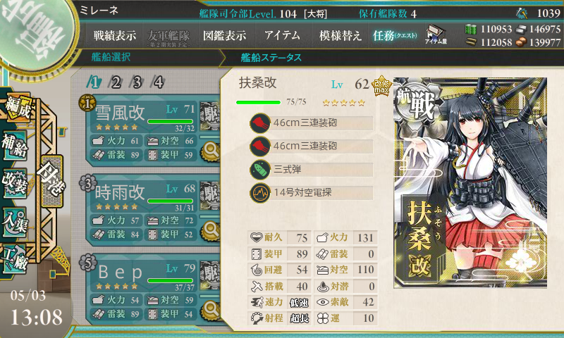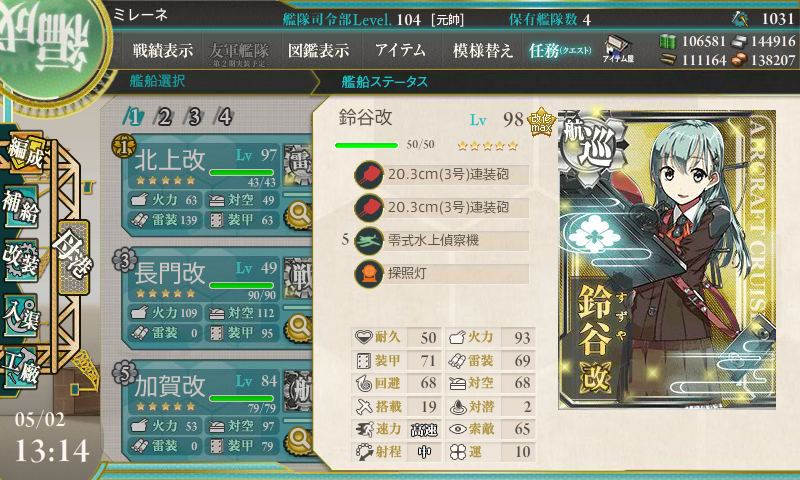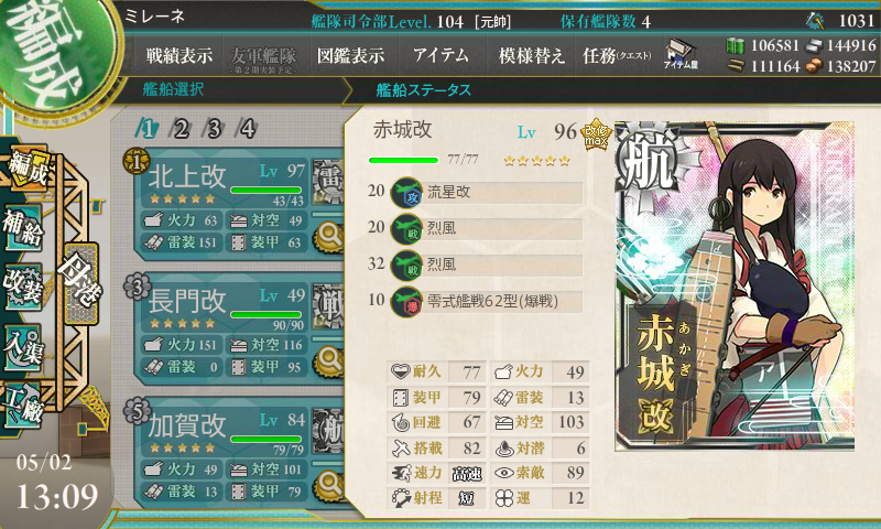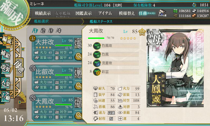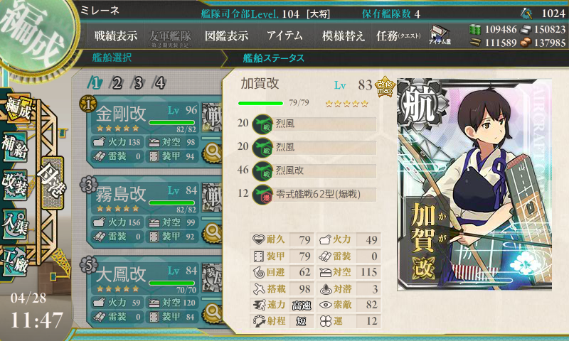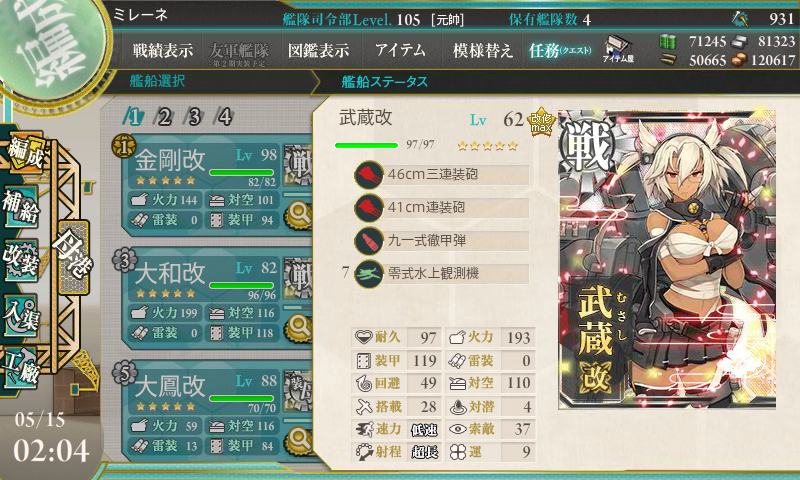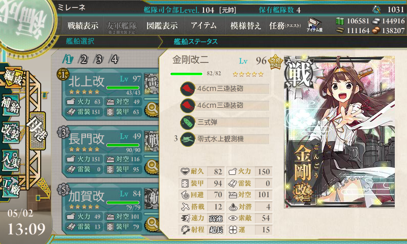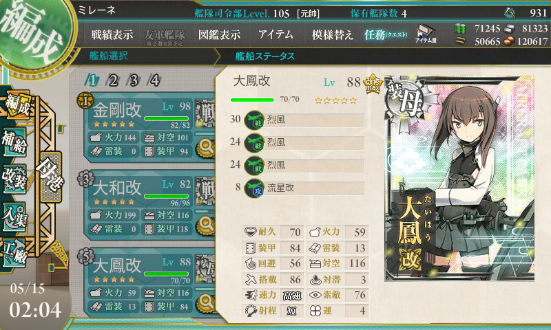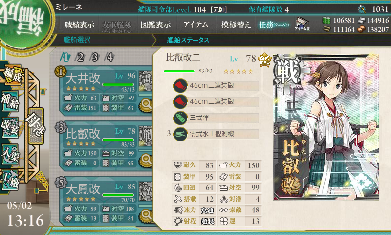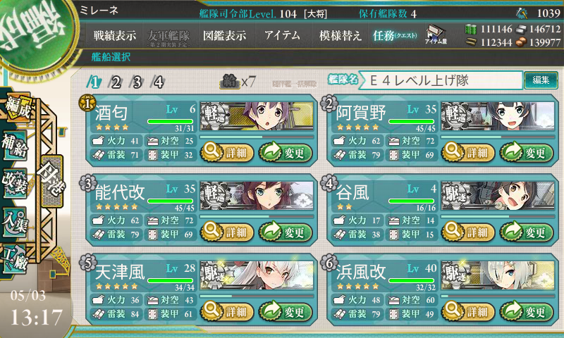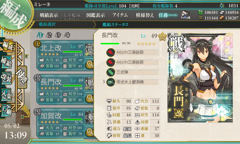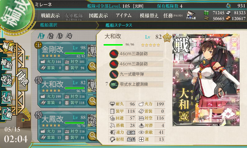 続いて編成と装備の紹介、2艦隊でローテ出撃してました