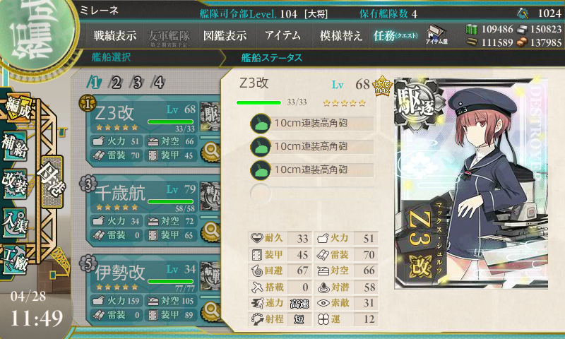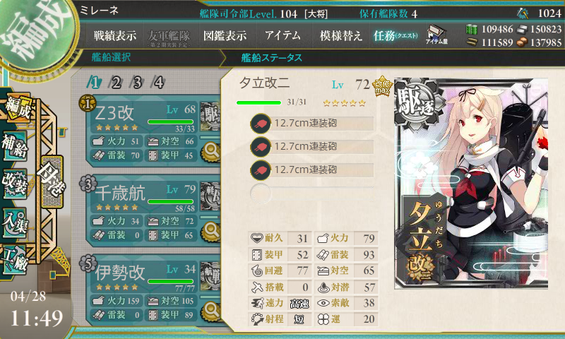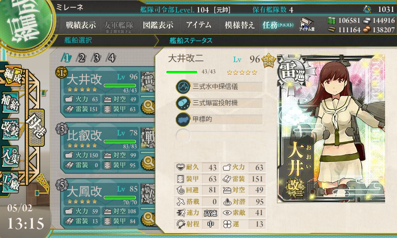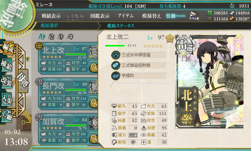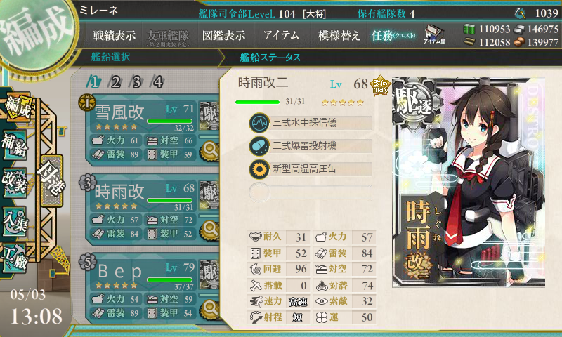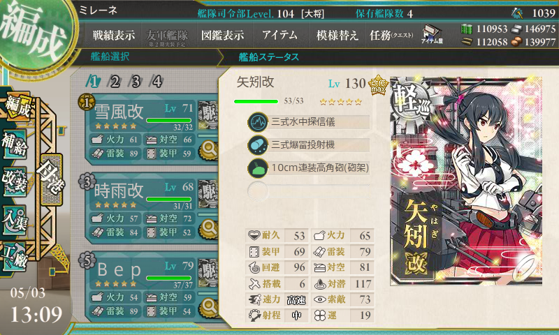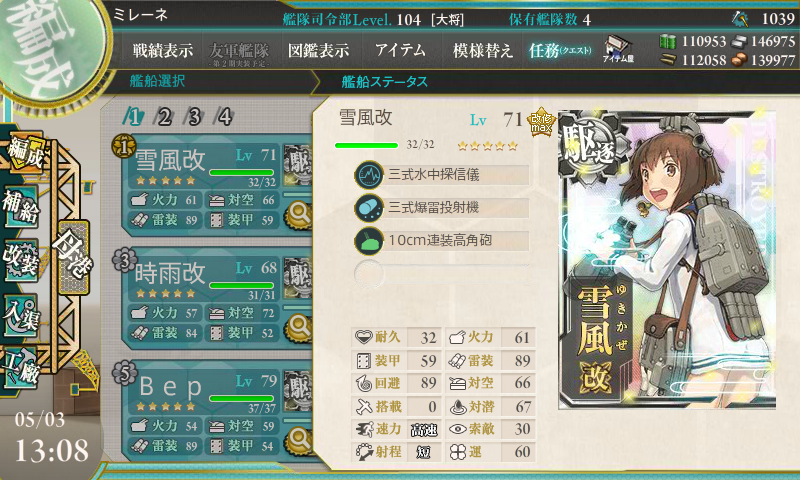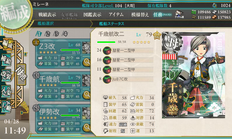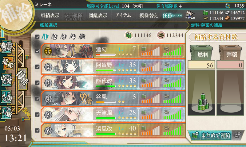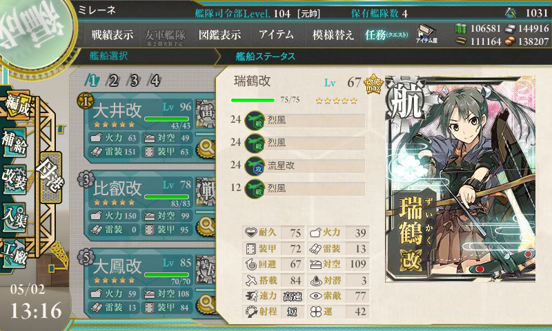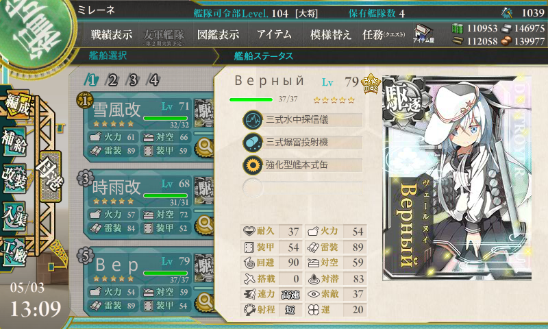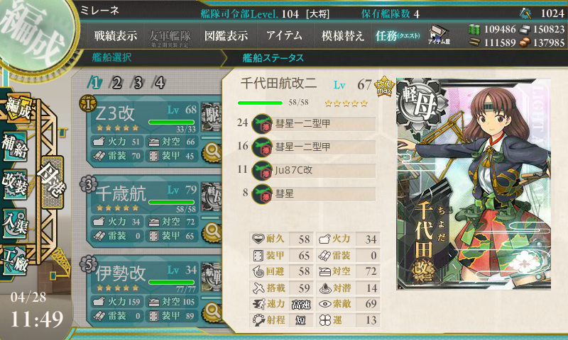 続いて編成と装備の紹介、2艦隊でローテ出撃してました