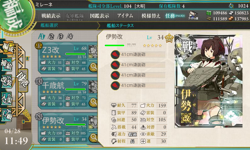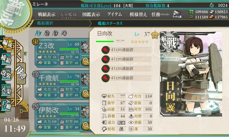 航重は昼連撃セット、ボス夜戦に備えて探照灯