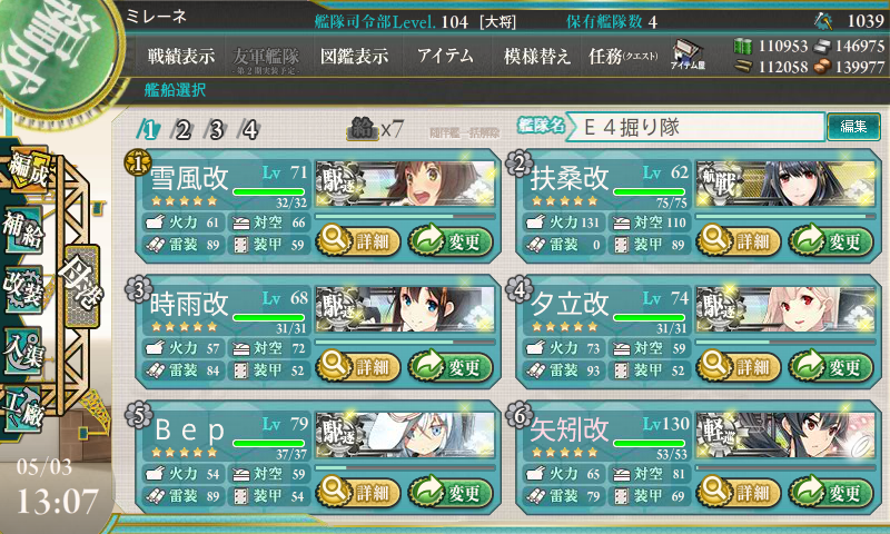 大半の出撃で道中支援を使用、支援艦隊はE5記事の編成と同じ感じ