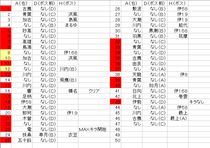 左の数字の赤が大破撤退、黄色はボス撃破、白はボス到達になります
