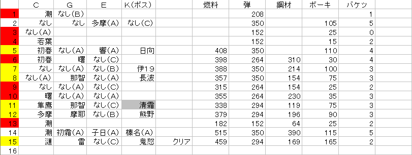 黄色はボス撃破、白は撃破ならず、水色はボス到達せずになります